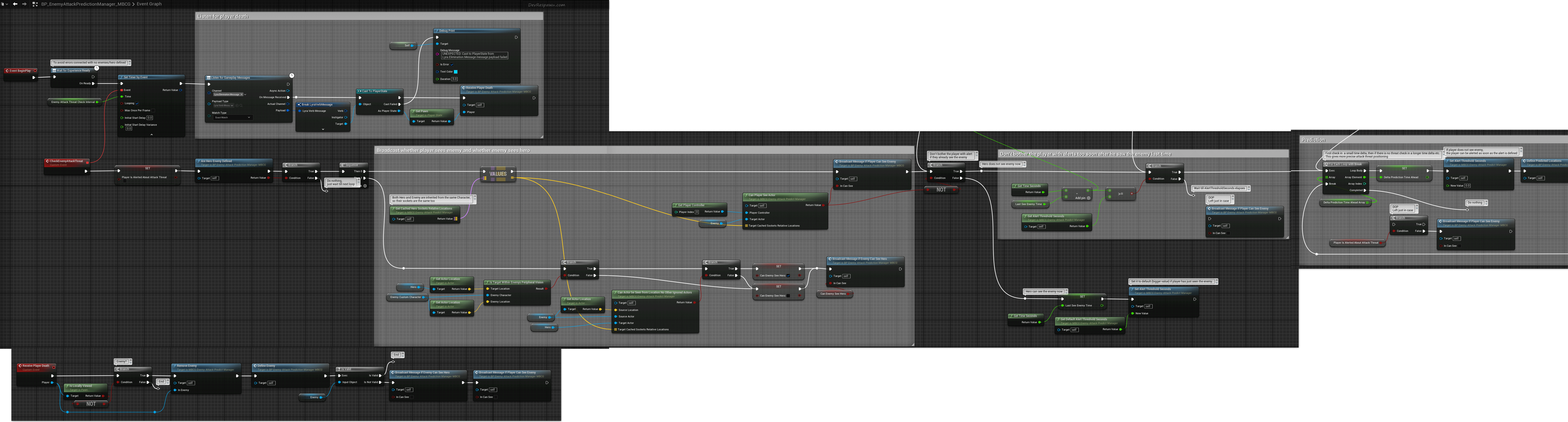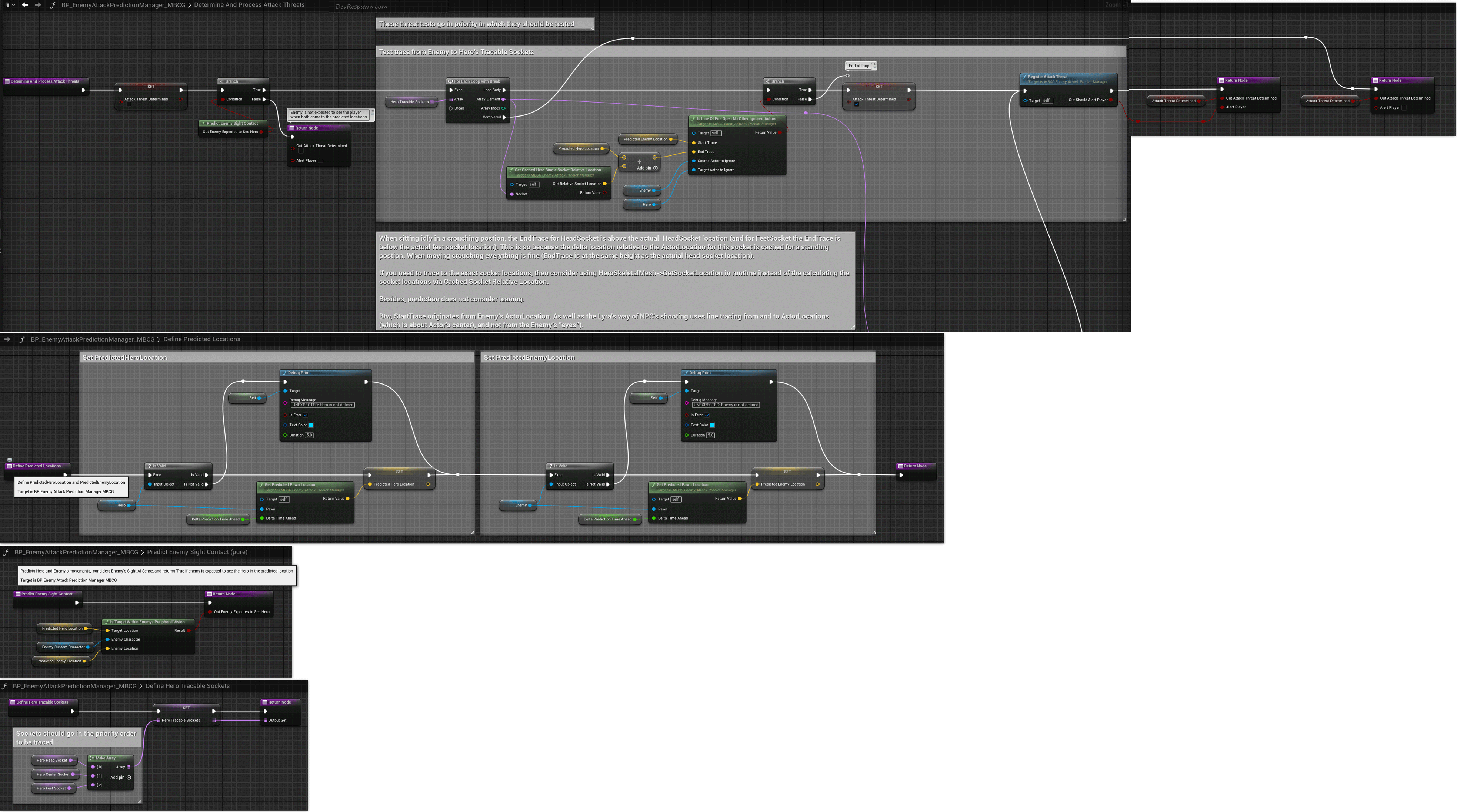 - Communication with other systems of the game (pawns, threat alert visualization), alerting logic is implemented in the blueprint inherited from the above C++ class. See BP_EnemyAttackPredictionManager_MBCG in my solution.