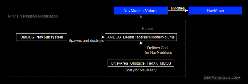 - UMBCG_NavSubsystem: custom UWorldSubsystem class that manages custom NavModiferVolumes, spawns and destroys them.