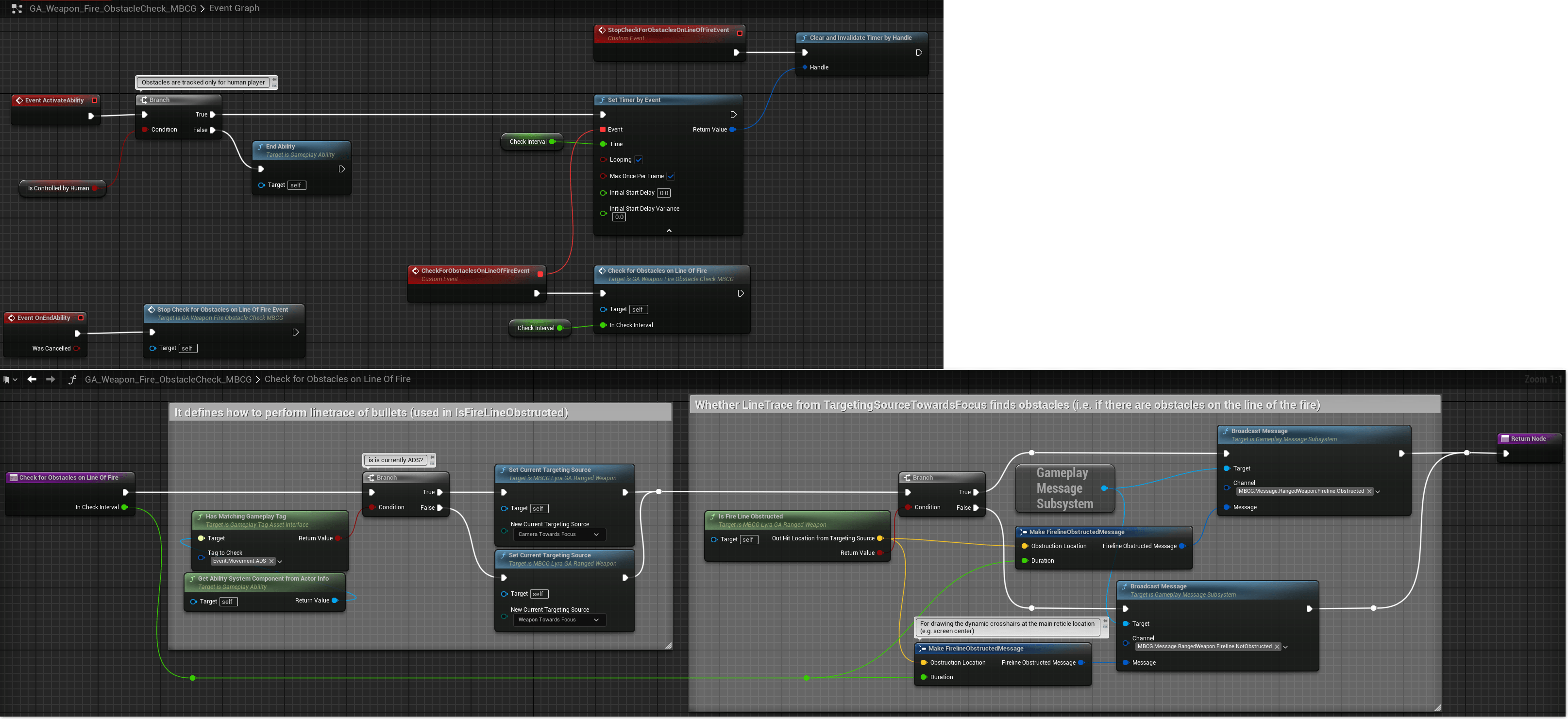 - Gameplay Ability blueprint (based on UMBCG_LyraGA_RangedWeapon, and added to all weapon ability sets e.g. to AbilitySet_ShooterPistol) broadcasts a message (using Gameplay Message Subsystem) with some time interval informing whether there is an obstacle on the line of fire. See GA_Weapon_Fire_ObstacleCheck_MBCG in my solution.